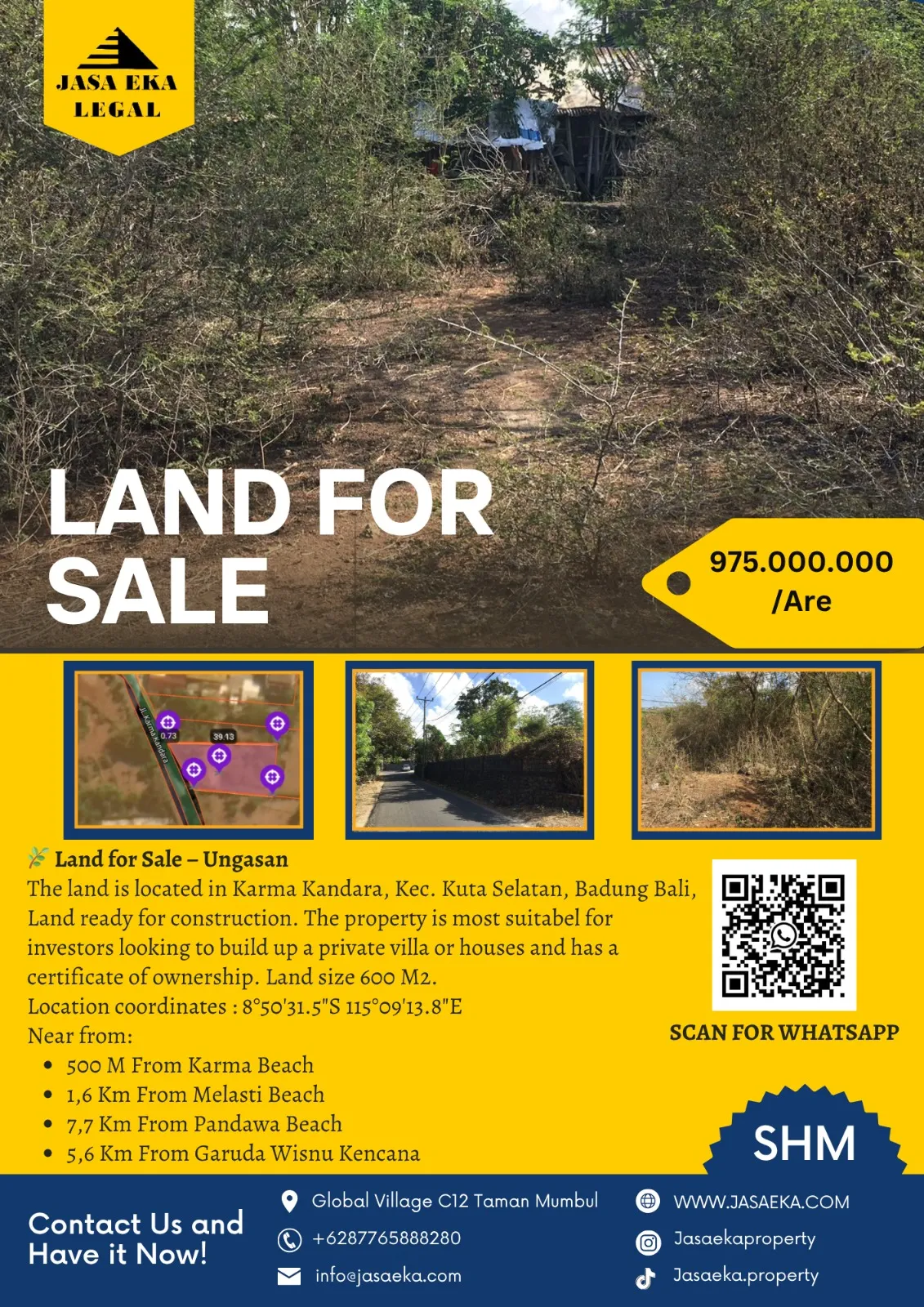 The land is located in Karma Kandara, Kec. Kuta Selatan, Badung Bali, Land ready for construction. The property is most suitabel for investors looking to build up a private villa or houses and has a certificate of ownership. Land size 600 M2.