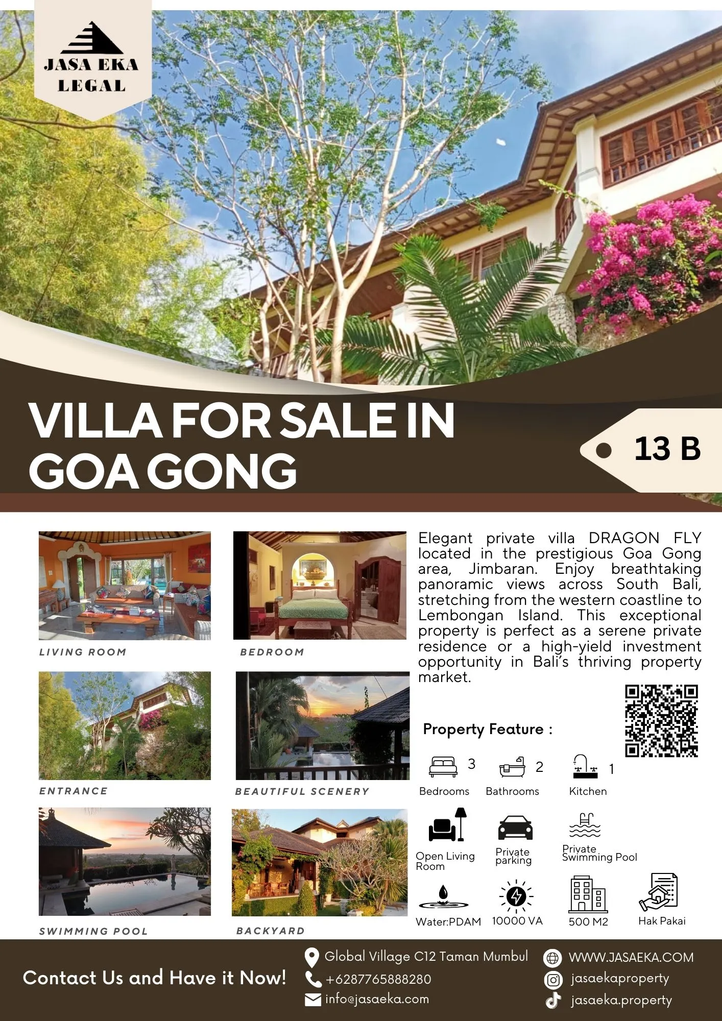 Elegant private villa DRAGON FLY located in the prestigious Goa Gong area, Jimbaran. Enjoy breathtaking panoramic views across South Bali, stretching from the western coastline to Lembongan Island. This exceptional property is perfect as a serene private residence or a high-yield investment opportunity in Bali's thriving property market.